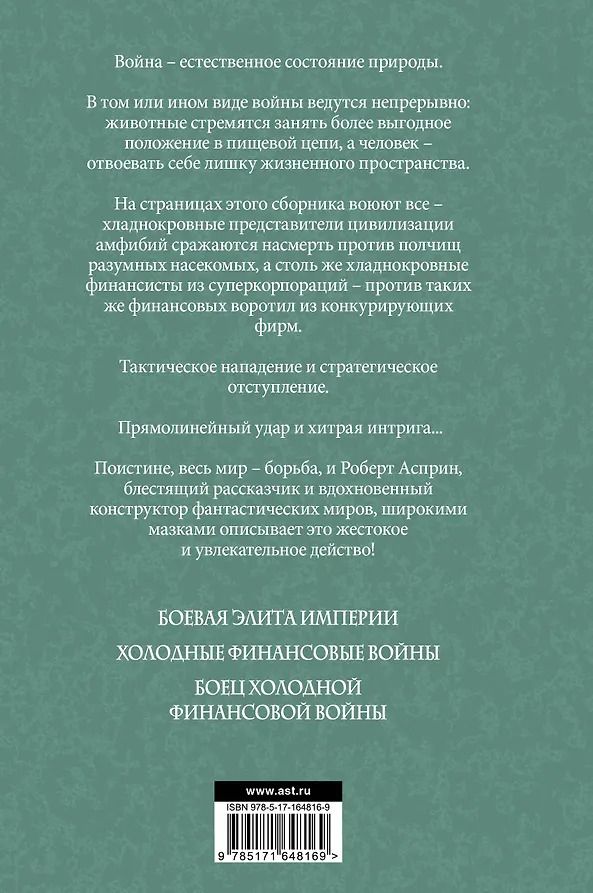 Сборник произведений Роберта Асприна о войнах в фантастических мирах и нашей реальности. В одних историях разумные насекомые сражаются с амфибиями, а в других рассказах многоуровневые противостояния устраивают транснациональные корпорации, финансисты и простые люди.