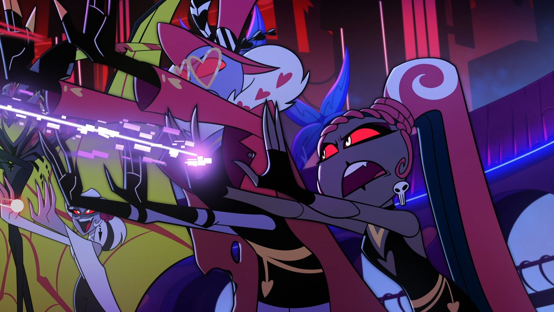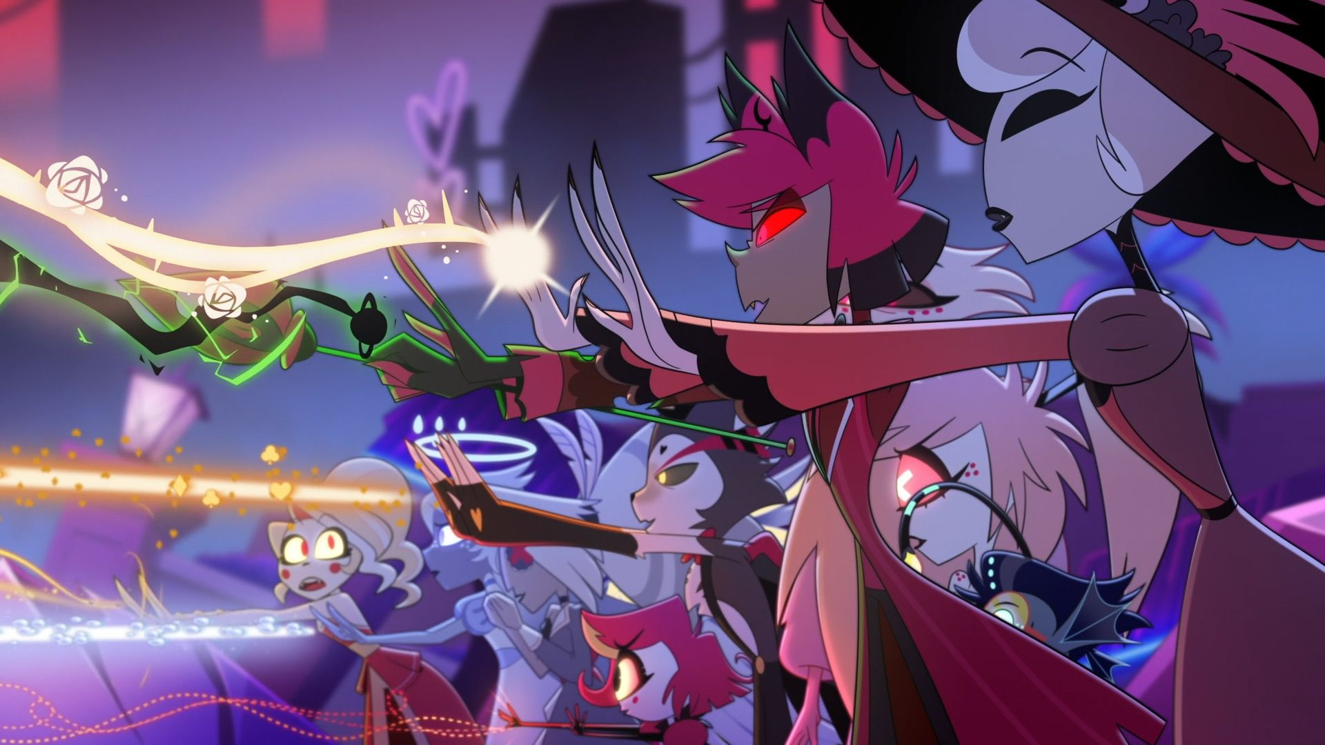 Авторы взвалили на себя непосильную ношу: им нужно было заставить зрителей проникнуться симпатией к о-о-очень противоречивым антигероям и показать неоднозначность местного конфликта, где с одной стороны представлены неисправимые социопаты, маньяки или опасные для окружающих инфантилы, а с другой — зазнавшиеся элитисты-ксенофобы, живущие в информационном пузыре. Интересный и сложный сценарный вызов! Однако мы имеем дело с создателями «Отеля Хазбин», поэтому происходящее и способы решения проблем напоминают блеклую копию «Вселенной Стивена», My Little Pony и «Клуба Винкс», но с персонажами, которые ругаются как нейросети.