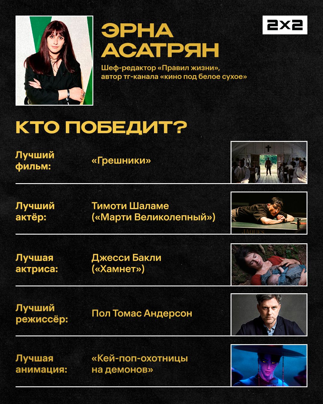 Для меня самой показательной будет победа в категории «Лучший режиссёр», которая будто собрана по социальной методичке, но едва ли вмещает всех заслуживающих признания (в первую очередь имею в виду Еву Виктор и ее ленту «Прости, детка»). Загибаем пальцы: большой американский мастер Пол Томас Андерсон, европейский фестивальный гость Йоаким Триер, кинематографистка с багажом признания Хлоя Чжао, выходец из инди-сегмента Джош Сэфди и темнокожий смельчак Райан Куглер. Вполне вероятно, что именно исход этой номинации определит к чьим голосам готовы прислушиваться киноакадемики в ближайшее время. Шон Бэйкер и «Анора» обратили внимание на мамблкорщиков, но едва ли «Оскар» пойдет по заданному курсу. Думаю, симпатии будут на стороне Куглера — в таком случае, возможно, фильмы ужасов, наконец, станут в полной мере замечать престижные премии, а не только фанаты жанра и маркетинга студии А24. Из последних достижений хорроров на «Оскаре» можно вспомнить разве что номинацию оператора Джарина Блашке за фильм «Маяк».
