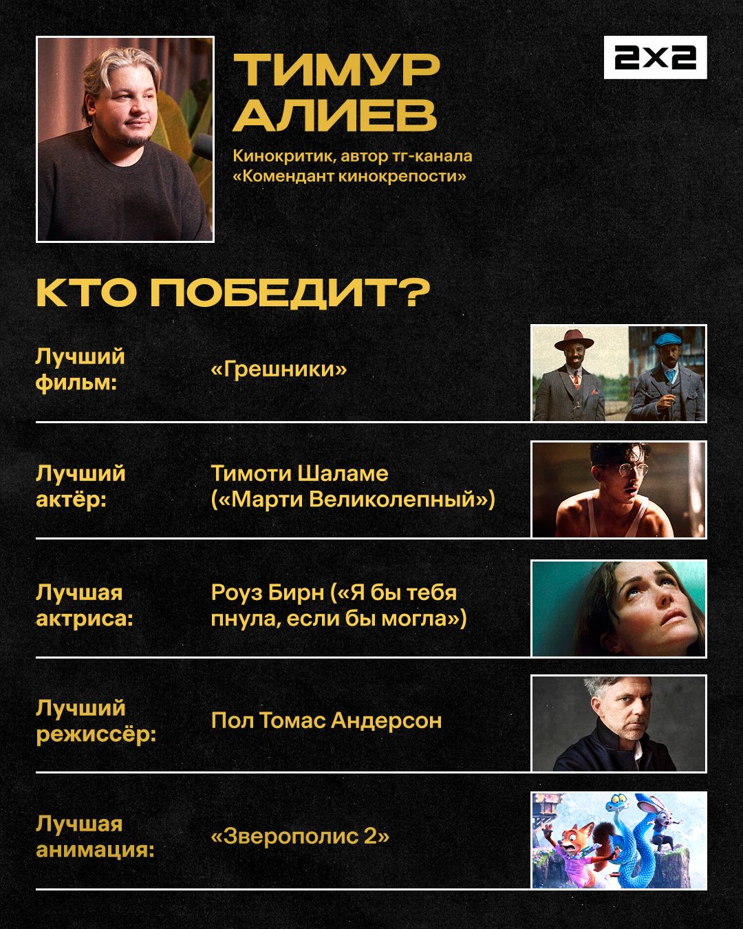 Мне кажется, самая любопытная номинация — «Лучшая мужская роль». Тимоти Шаламе очень хочет «Оскар». Актёр активно продвигал «Марти Великолепного», но в последние недели за фильмом тянется шлейф скандалов. Пока не очень понятно, насколько сильное влияние окажет информационный шум. Я бы, наверное, хотел, чтобы Шаламе победил, успокоился и продолжил заниматься любимым делом, не заморачиваясь по поводу наград.