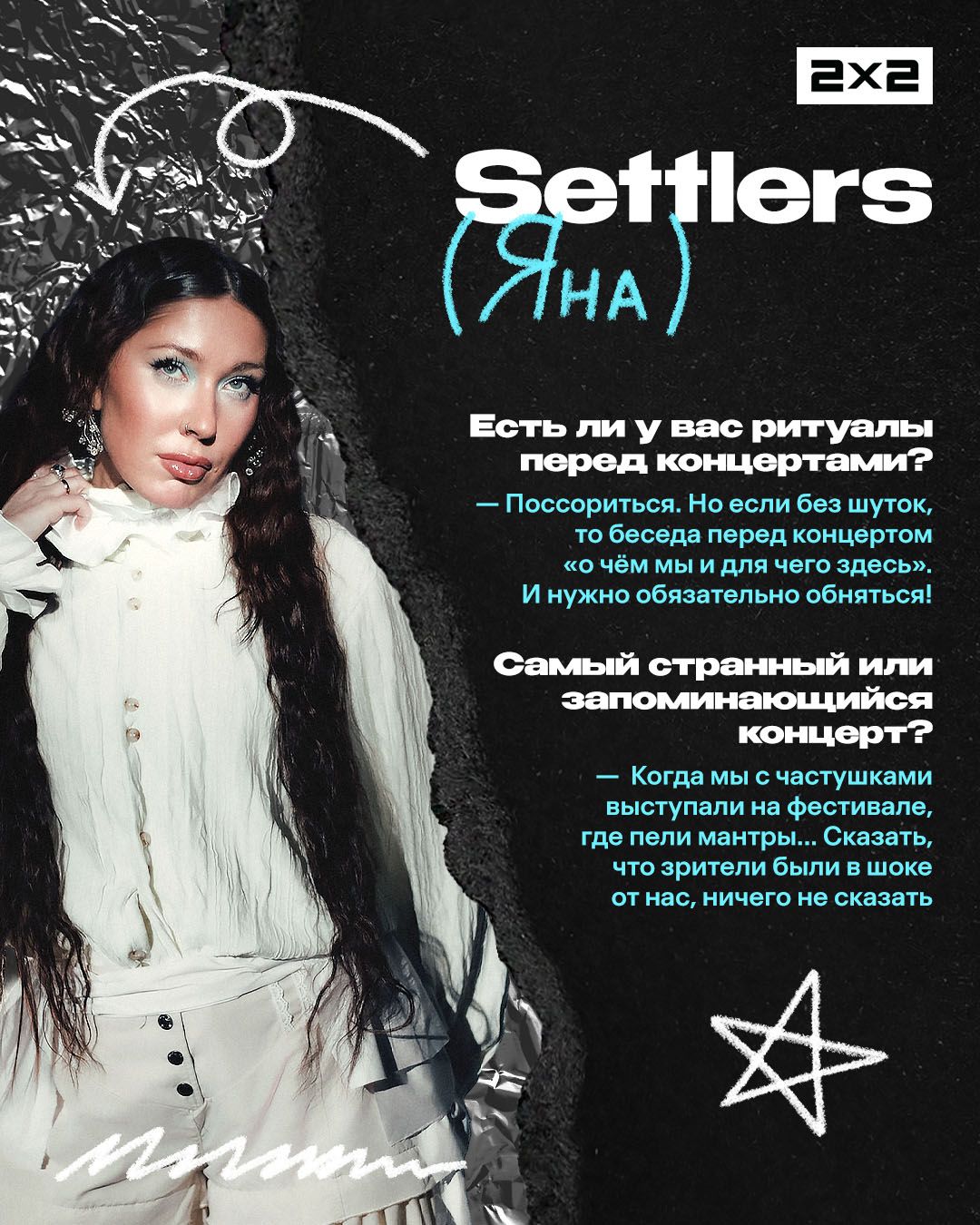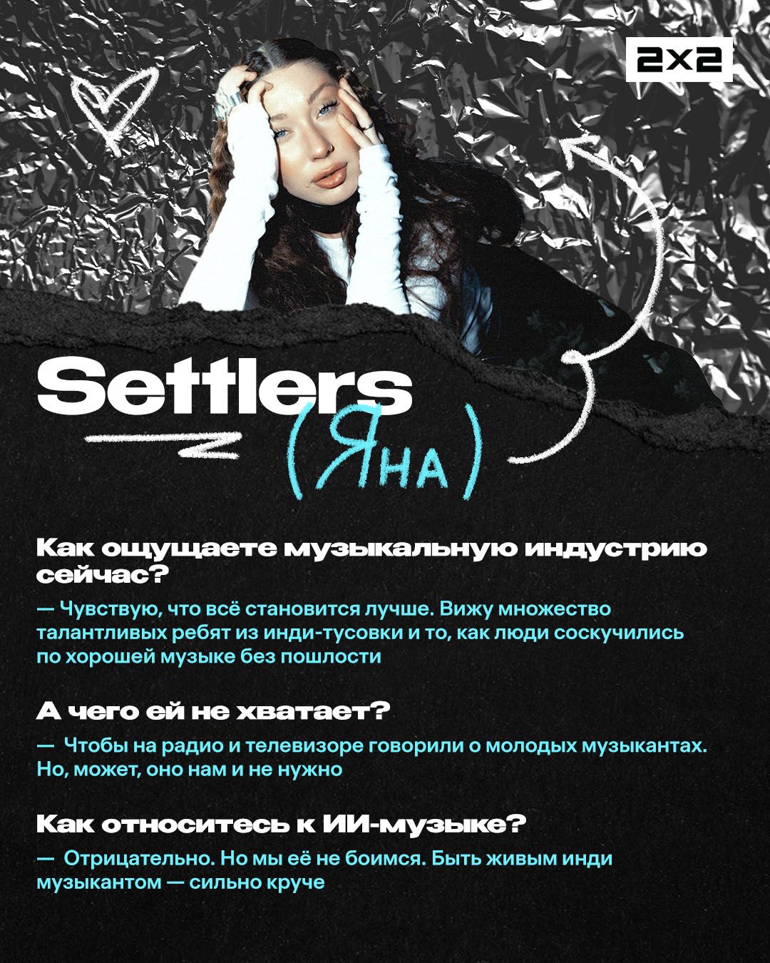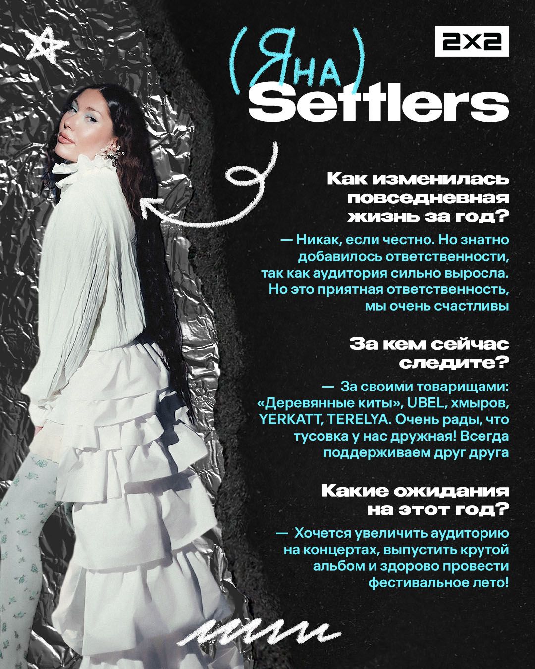 <p>Settlers — группа, которая за один год вышла из разряда «новых имён» в топы инди-сцены. Трек ребят «По камушку» разошёлся по чартам, соцсетям и точно попадался вам в ленте вертикальных роликов. А в апреле группа отыграет два сольных концерта: 21 апреля в Санкт-Петербурге и 29 — в Москве. </p><p>Мы поговорили с солисткой группы Яной о недооценённых песнях, ИИ-музыке и ожиданиях на год. Ответы ищите в карточках.</p><figure class="kg-card kg-gallery-card kg-width-wide kg-card-hascaption"><div class="kg-gallery-container"><div class="kg-gallery-row"><div class="kg-gallery-image"><img src="https://media.2x2tv.ru/content/images/2026/04/----1-2.jpg" width="1080" height="1350" loading="lazy" alt srcset="https://media.2x2tv.ru/content/images/size/w600/2026/04/----1-2.jpg 600w, https://media.2x2tv.ru/content/images/size/w1000/2026/04/----1-2.jpg 1000w, https://media.2x2tv.ru/content/images/2026/04/----1-2.jpg 1080w" sizes="(min-width: 720px) 720px"></div><div class="kg-gallery-image"><img src="https://media.2x2tv.ru/content/images/2026/04/----2.jpg" width="1080" height="1350" loading="lazy" alt srcset="https://media.2x2tv.ru/content/images/size/w600/2026/04/----2.jpg 600w, https://media.2x2tv.ru/content/images/size/w1000/2026/04/----2.jpg 1000w, https://media.2x2tv.ru/content/images/2026/04/----2.jpg 1080w" sizes="(min-width: 720px) 720px"></div><div class="kg-gallery-image"><img src="https://media.2x2tv.ru/content/images/2026/04/----3.jpg" width="1080" height="1350" loading="lazy" alt srcset="https://media.2x2tv.ru/content/images/size/w600/2026/04/----3.jpg 600w, https://media.2x2tv.ru/content/images/size/w1000/2026/04/----3.jpg 1000w, https://media.2x2tv.ru/content/images/2026/04/----3.jpg 1080w" sizes="(min-width: 720px) 720px"></div></div><div class="kg-gallery-row"><div class="kg-gallery-image"><img src="https://media.2x2tv.ru/content/images/2026/04/----4.jpg" width="1080" height="1350" loading="lazy" alt srcset="https://media.2x2tv.ru/content/images/size/w600/2026/04/----4.jpg 600w, https://media.2x2tv.ru/content/images/size/w1000/2026/04/----4.jpg 1000w, https://media.2x2tv.ru/content/images/2026/04/----4.jpg 1080w" sizes="(min-width: 720px) 720px"></div><div class="kg-gallery-image"><img src="https://media.2x2tv.ru/content/images/2026/04/----5.jpg" width="1080" height="1350" loading="lazy" alt srcset="https://media.2x2tv.ru/content/images/size/w600/2026/04/----5.jpg 600w, https://media.2x2tv.ru/content/images/size/w1000/2026/04/----5.jpg 1000w, https://media.2x2tv.ru/content/images/2026/04/----5.jpg 1080w" sizes="(min-width: 720px) 720px"></div><div class="kg-gallery-image"><img src="https://media.2x2tv.ru/content/images/2026/04/----6--1-.jpg" width="1080" height="1350" loading="lazy" alt srcset="https://media.2x2tv.ru/content/images/size/w600/2026/04/----6--1-.jpg 600w, https://media.2x2tv.ru/content/images/size/w1000/2026/04/----6--1-.jpg 1000w, https://media.2x2tv.ru/content/images/2026/04/----6--1-.jpg 1080w" sizes="(min-width: 720px) 720px"></div></div><div class="kg-gallery-row"><div class="kg-gallery-image"><img src="https://media.2x2tv.ru/content/images/2026/04/----7.jpg" width="1080" height="1350" loading="lazy" alt srcset="https://media.2x2tv.ru/content/images/size/w600/2026/04/----7.jpg 600w, https://media.2x2tv.ru/content/images/size/w1000/2026/04/----7.jpg 1000w, https://media.2x2tv.ru/content/images/2026/04/----7.jpg 1080w" sizes="(min-width: 720px) 720px"></div><div class="kg-gallery-image"><img src="https://media.2x2tv.ru/content/images/2026/04/----8.jpg" width="1080" height="1350" loading="lazy" alt srcset="https://media.2x2tv.ru/content/images/size/w600/2026/04/----8.jpg 600w, https://media.2x2tv.ru/content/images/size/w1000/2026/04/----8.jpg 1000w, https://media.2x2tv.ru/content/images/2026/04/----8.jpg 1080w" sizes="(min-width: 720px) 720px"></div><div class="kg-gallery-image"><img src="https://media.2x2tv.ru/content/images/2026/04/----9-2.jpg" width="1080" height="1350" loading="lazy" alt srcset="https://media.2x2tv.ru/content/images/size/w600/2026/04/----9-2.jpg 600w, https://media.2x2tv.ru/content/images/size/w1000/2026/04/----9-2.jpg 1000w, https://media.2x2tv.ru/content/images/2026/04/----9-2.jpg 1080w" sizes="(min-width: 720px) 720px"></div></div></div><figcaption><em><em><em>Блиц-карточки / 2х2.медиа</em></em></em></figcaption></figure><figure class="kg-card kg-bookmark-card"><a class="kg-bookmark-container" href="https://media.2x2tv.ru/buerak/"><div class="kg-bookmark-content"><div class="kg-bookmark-title">Группа «Буерак» — о новом альбоме и своём стиле</div><div class="kg-bookmark-description">Разговариваем с авторами некоммерчески-коммерческой музыки.</div><div class="kg-bookmark-metadata"><img class="kg-bookmark-icon" src="https://media.2x2tv.ru/apple-touch-icon.png?v=260923" alt=""><span class="kg-bookmark-author">2х2.медиа</span><span class="kg-bookmark-publisher">Маша Медведева</span></div></div><div class="kg-bookmark-thumbnail"><img src="https://media.2x2tv.ru/content/images/2025/11/30----5-------1.png" alt=""></div></a></figure>