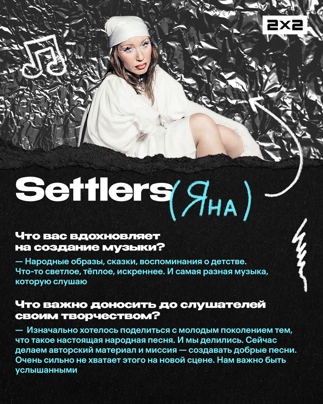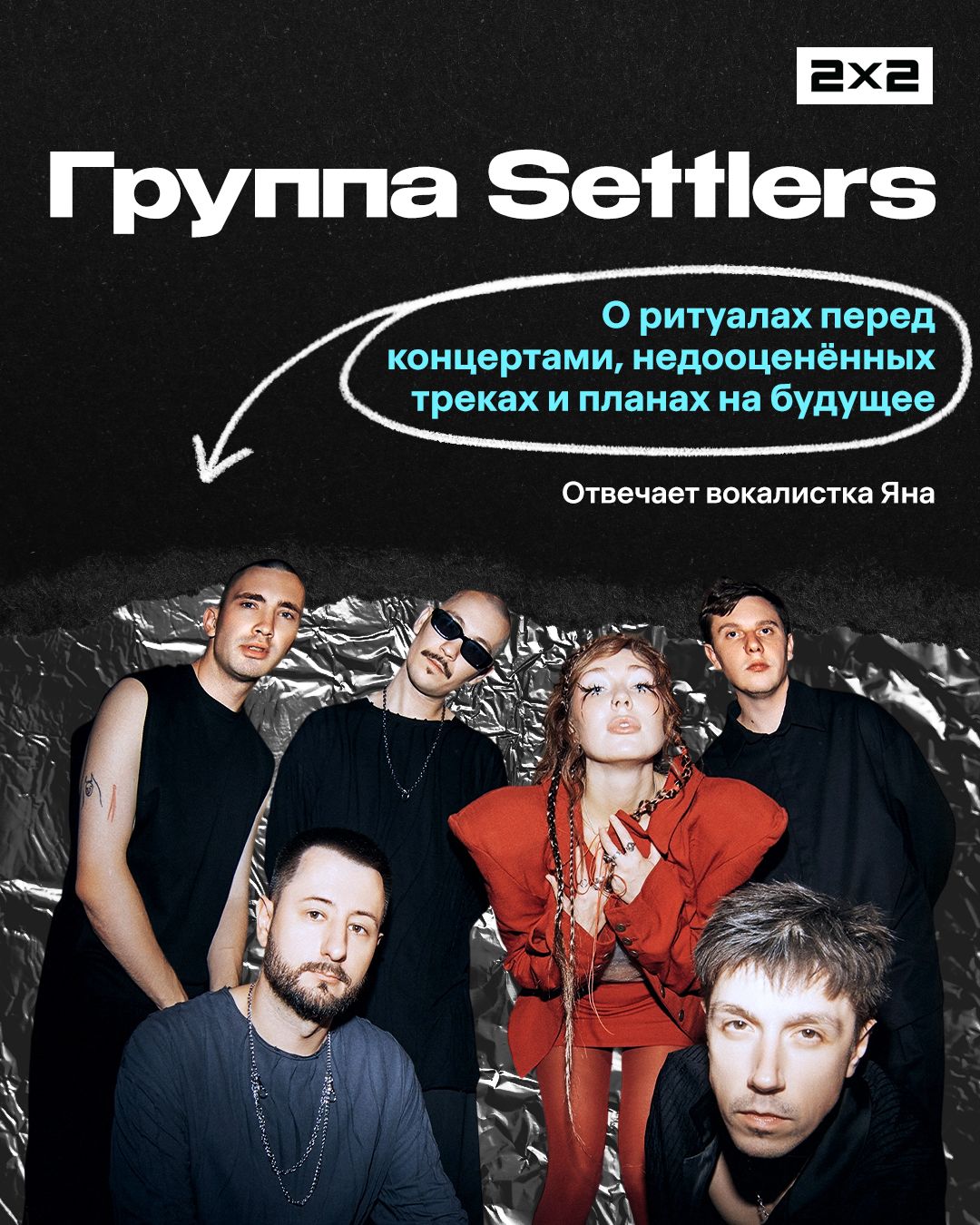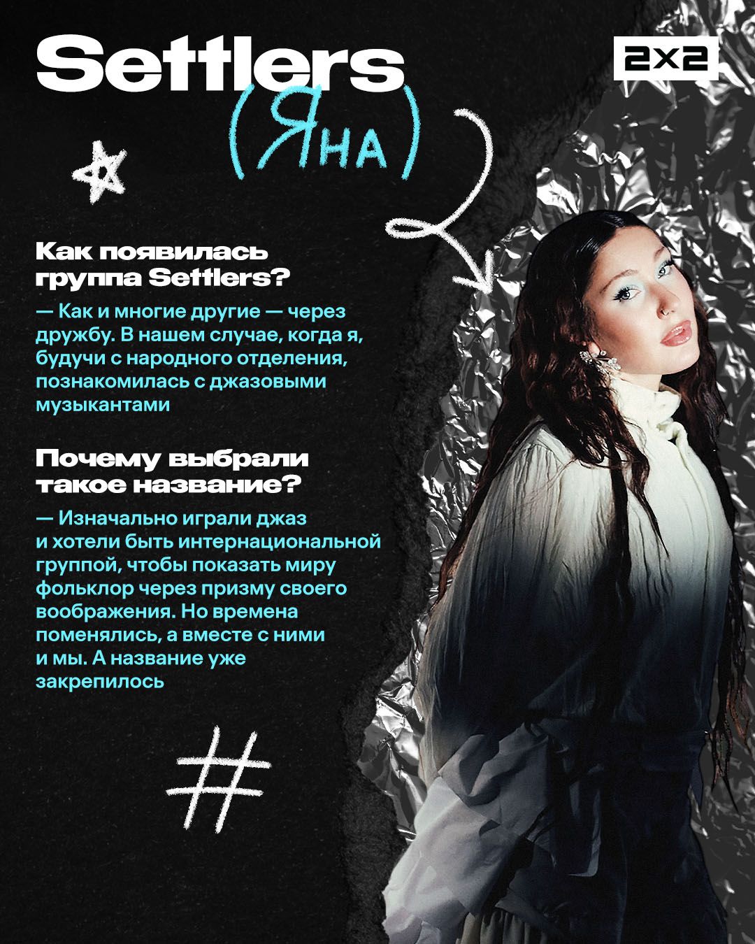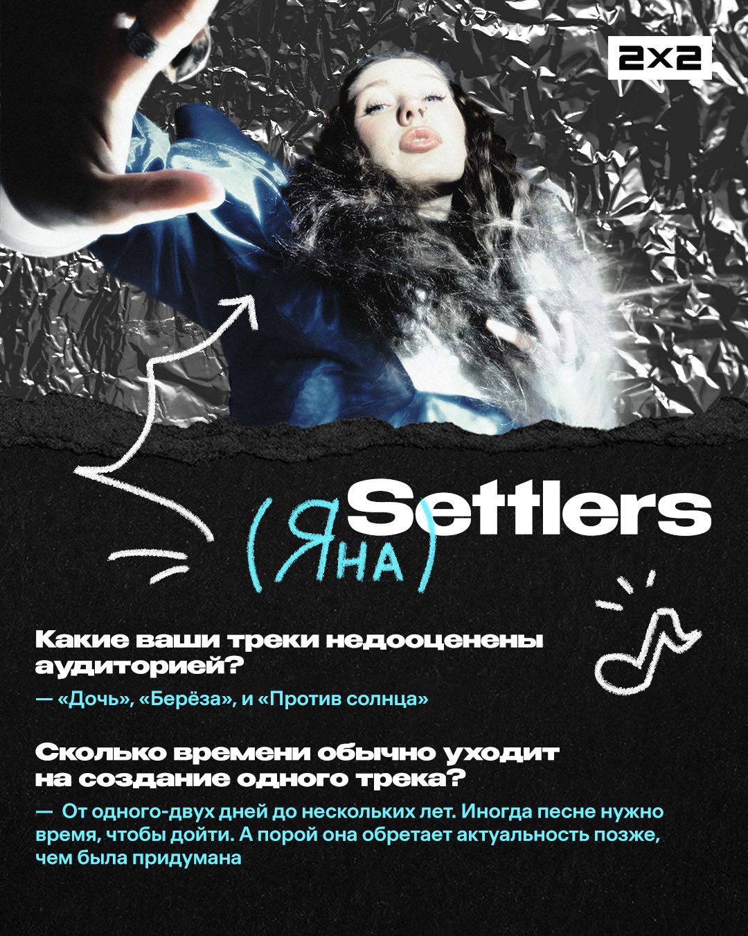 <p>Settlers — группа, которая за один год вышла из разряда «новых имён» в топы инди-сцены. Трек ребят «По камушку» разошёлся по чартам, соцсетям и точно попадался вам в ленте вертикальных роликов. А в апреле группа отыграет два сольных концерта: 21 апреля в Санкт-Петербурге и 29 — в Москве. </p><p>Мы поговорили с солисткой группы Яной о недооценённых песнях, ИИ-музыке и ожиданиях на год. Ответы ищите в карточках.</p><figure class="kg-card kg-gallery-card kg-width-wide kg-card-hascaption"><div class="kg-gallery-container"><div class="kg-gallery-row"><div class="kg-gallery-image"><img src="https://media.2x2tv.ru/content/images/2026/04/----1-2.jpg" width="1080" height="1350" loading="lazy" alt srcset="https://media.2x2tv.ru/content/images/size/w600/2026/04/----1-2.jpg 600w, https://media.2x2tv.ru/content/images/size/w1000/2026/04/----1-2.jpg 1000w, https://media.2x2tv.ru/content/images/2026/04/----1-2.jpg 1080w" sizes="(min-width: 720px) 720px"></div><div class="kg-gallery-image"><img src="https://media.2x2tv.ru/content/images/2026/04/----2.jpg" width="1080" height="1350" loading="lazy" alt srcset="https://media.2x2tv.ru/content/images/size/w600/2026/04/----2.jpg 600w, https://media.2x2tv.ru/content/images/size/w1000/2026/04/----2.jpg 1000w, https://media.2x2tv.ru/content/images/2026/04/----2.jpg 1080w" sizes="(min-width: 720px) 720px"></div><div class="kg-gallery-image"><img src="https://media.2x2tv.ru/content/images/2026/04/----3.jpg" width="1080" height="1350" loading="lazy" alt srcset="https://media.2x2tv.ru/content/images/size/w600/2026/04/----3.jpg 600w, https://media.2x2tv.ru/content/images/size/w1000/2026/04/----3.jpg 1000w, https://media.2x2tv.ru/content/images/2026/04/----3.jpg 1080w" sizes="(min-width: 720px) 720px"></div></div><div class="kg-gallery-row"><div class="kg-gallery-image"><img src="https://media.2x2tv.ru/content/images/2026/04/----4.jpg" width="1080" height="1350" loading="lazy" alt srcset="https://media.2x2tv.ru/content/images/size/w600/2026/04/----4.jpg 600w, https://media.2x2tv.ru/content/images/size/w1000/2026/04/----4.jpg 1000w, https://media.2x2tv.ru/content/images/2026/04/----4.jpg 1080w" sizes="(min-width: 720px) 720px"></div><div class="kg-gallery-image"><img src="https://media.2x2tv.ru/content/images/2026/04/----5.jpg" width="1080" height="1350" loading="lazy" alt srcset="https://media.2x2tv.ru/content/images/size/w600/2026/04/----5.jpg 600w, https://media.2x2tv.ru/content/images/size/w1000/2026/04/----5.jpg 1000w, https://media.2x2tv.ru/content/images/2026/04/----5.jpg 1080w" sizes="(min-width: 720px) 720px"></div><div class="kg-gallery-image"><img src="https://media.2x2tv.ru/content/images/2026/04/----6--1-.jpg" width="1080" height="1350" loading="lazy" alt srcset="https://media.2x2tv.ru/content/images/size/w600/2026/04/----6--1-.jpg 600w, https://media.2x2tv.ru/content/images/size/w1000/2026/04/----6--1-.jpg 1000w, https://media.2x2tv.ru/content/images/2026/04/----6--1-.jpg 1080w" sizes="(min-width: 720px) 720px"></div></div><div class="kg-gallery-row"><div class="kg-gallery-image"><img src="https://media.2x2tv.ru/content/images/2026/04/----7.jpg" width="1080" height="1350" loading="lazy" alt srcset="https://media.2x2tv.ru/content/images/size/w600/2026/04/----7.jpg 600w, https://media.2x2tv.ru/content/images/size/w1000/2026/04/----7.jpg 1000w, https://media.2x2tv.ru/content/images/2026/04/----7.jpg 1080w" sizes="(min-width: 720px) 720px"></div><div class="kg-gallery-image"><img src="https://media.2x2tv.ru/content/images/2026/04/----8.jpg" width="1080" height="1350" loading="lazy" alt srcset="https://media.2x2tv.ru/content/images/size/w600/2026/04/----8.jpg 600w, https://media.2x2tv.ru/content/images/size/w1000/2026/04/----8.jpg 1000w, https://media.2x2tv.ru/content/images/2026/04/----8.jpg 1080w" sizes="(min-width: 720px) 720px"></div><div class="kg-gallery-image"><img src="https://media.2x2tv.ru/content/images/2026/04/----9-2.jpg" width="1080" height="1350" loading="lazy" alt srcset="https://media.2x2tv.ru/content/images/size/w600/2026/04/----9-2.jpg 600w, https://media.2x2tv.ru/content/images/size/w1000/2026/04/----9-2.jpg 1000w, https://media.2x2tv.ru/content/images/2026/04/----9-2.jpg 1080w" sizes="(min-width: 720px) 720px"></div></div></div><figcaption><em><em><em>Блиц-карточки / 2х2.медиа</em></em></em></figcaption></figure><figure class="kg-card kg-bookmark-card"><a class="kg-bookmark-container" href="https://media.2x2tv.ru/buerak/"><div class="kg-bookmark-content"><div class="kg-bookmark-title">Группа «Буерак» — о новом альбоме и своём стиле</div><div class="kg-bookmark-description">Разговариваем с авторами некоммерчески-коммерческой музыки.</div><div class="kg-bookmark-metadata"><img class="kg-bookmark-icon" src="https://media.2x2tv.ru/apple-touch-icon.png?v=260923" alt=""><span class="kg-bookmark-author">2х2.медиа</span><span class="kg-bookmark-publisher">Маша Медведева</span></div></div><div class="kg-bookmark-thumbnail"><img src="https://media.2x2tv.ru/content/images/2025/11/30----5-------1.png" alt=""></div></a></figure>