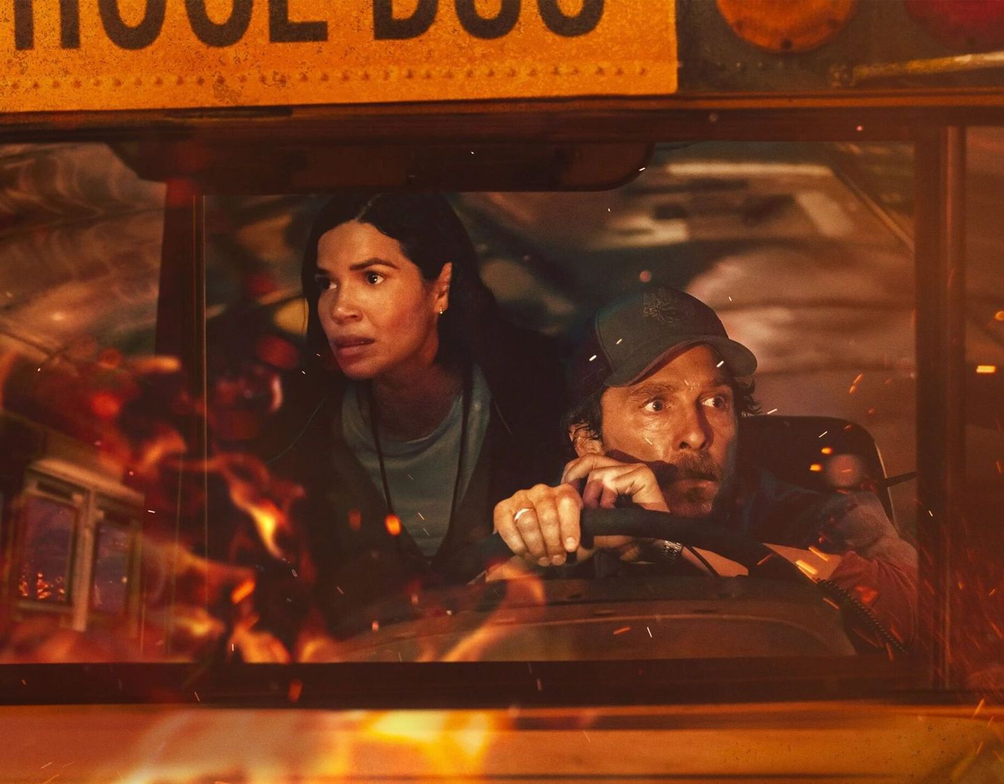 Помимо того, что Кевин переживает из-за испорченных отношений с отцом, с которым так и не успел поговорить, у него не складывается диалог и с собственным сыном-подростком (Леви Макконахи — да, Мэттью увлёкся кумовством и подтянул почти всю семью). Ещё, как назло, у любимого пса обнаружили рак и пришлось его усыпить. Для полноты картины не хватало только природной катастрофы, поэтому в лесу оборвались ЛЭП и загорелась трава. Огонь быстро распространился и добрался до города, на дорогах начался хаос. Когда власти объявили эвакуацию, мужчина вызвался помочь вывезти два десятка детей в безопасную зону. Сопровождает его в этом опасном противостоянии катастрофе школьная учительница Мэри (Америка Феррера — что удивительно, не родственница актёра).